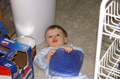 Wow, my boy's getting so big. He's up to 31 inches tall which is plenty tall to get into the sippy cup drawer (the only one except for the top silverware drawer we didn't lock. He's babbling more now, saying something that sounds like "thank you" (tank too), "pee bo" (peek a boo), and once we heard diaper (immitating what we said back). Of course the talking is non stop one day and non existant the next. He's still on the cusp of walking. He stands well and can take a step but prefers not to! Little goomer! He's still on antibiotics for an ear infection (took him to the doctor last wednesday), he takes medicine really well! That's all for now!